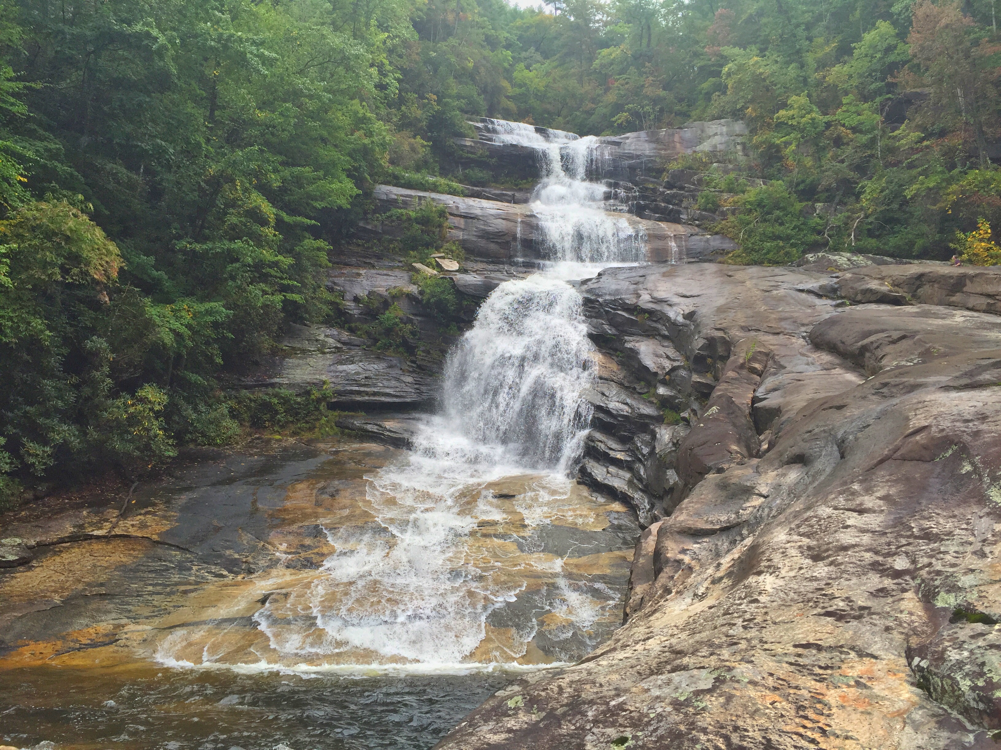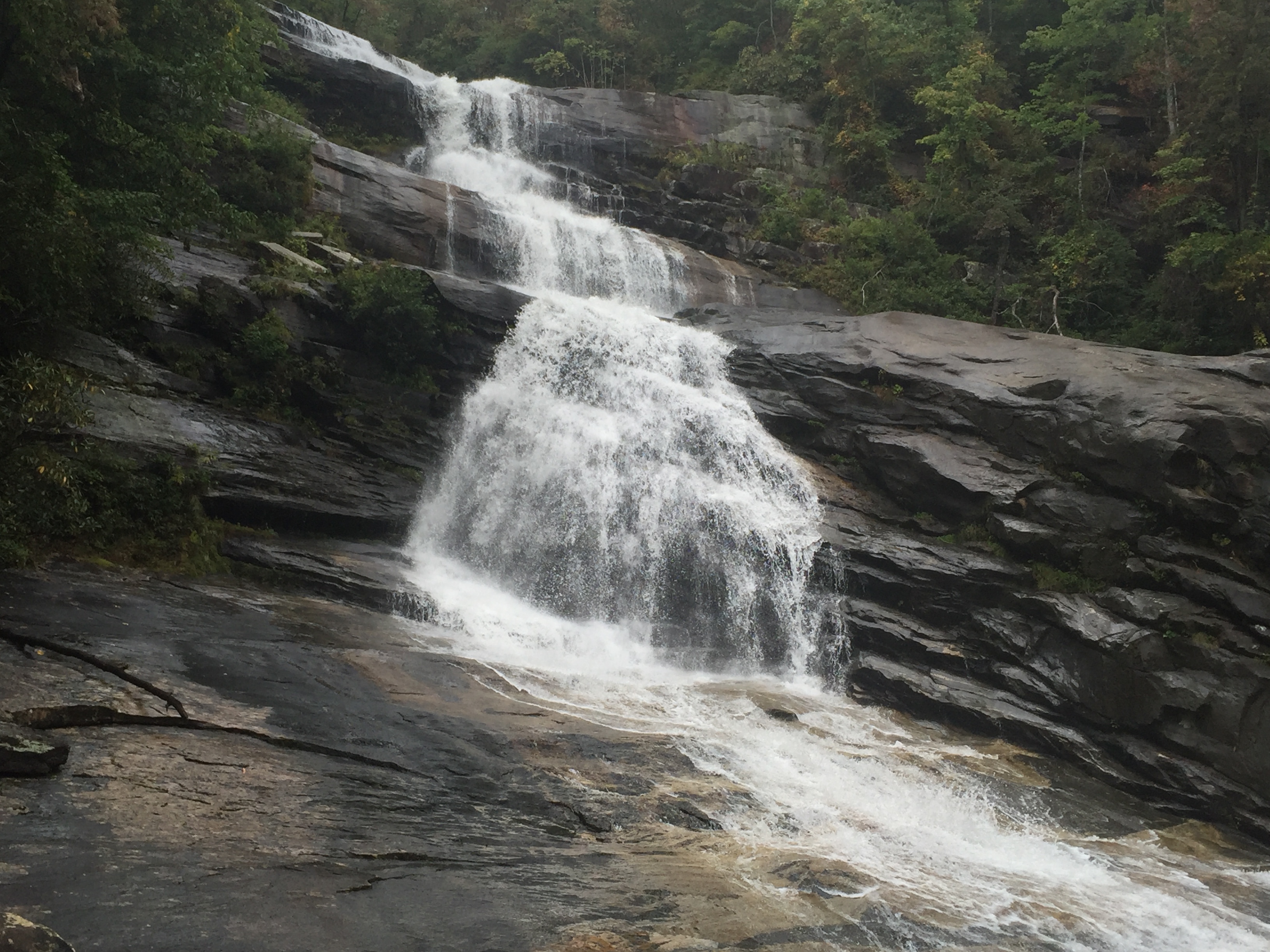 If this stick wasn’t here, or if Beth hadn’t just been here a week ago, this side trail would be very easy to walk right past. I have heard stories of this happening, and the waterfall not being found. At this point, you are so far above Big Falls that it can’t really even be heard, certainly not enough to distinguish them from any other cascade. The terrain is fairly level as well here, HOWEVER….this is where the easy to moderate stroll becomes steep and strenuous. Before it got tough, I had a brief encounter with some extreme briars that made some intense, deep scratches on my right leg. It didn’t matter. We had come way too far to worry about a few scratches and on we went. This trail for next 1/3 of a mile or so, changes fast from near level, to moderate, to steep, to rope assisted climbing. There were at least 10 short ropes in place to help the near vertical descent in places down the mostly dirt trail. All were in good shape except one that was slightly frayed. There are also some trees, rhododendron and rocks to hold onto along with the ropes for stability. I can’t stress this next part enough…..Do not be in a hurry on this stretch. It could end badly. I don’t usually make strong statements like that so please take notice. It is safe if you are mobile, and take your time, and descend careful and strategically. A large rock must be navigated down and through towards the ends of the steepest section, again rope assisted. After this, the Thompson River is in sight, just down below. Big Falls is just upstream, still out of sight, but definitely making some serious noise. Once the trail makes it to near the river level, I would love to say that you have made it….but there is still some fairly intense bushwhacking upstream through some thick fallen trees and rocks, and low rhododendrons. While Mark found his own way off trail, Beth led me through some tight fallen trees and thick rhododendron that just about got me stuck. She is also about 1/4 of my size and did not have near the difficulty that I did here. On the way back I refused to go back that way and found an easier path by just going up a little then coming back down. The trail finally spits you out into the relatively small pool below Big Falls. Before I could even think to enjoy this, I needed several moments to rest and recover from what was the most intense decline that I have ever made. Mark, the seasoned climber, had already rock hopped into the middle of the Thompson and was capturing images. It was gray & cloudy, with light winds and the waterfall was just amazing! The conditions were pristine! It looks sooooo much different in person than it does in any photo that I have seen. 125 feet coming straight down over a series of falls with a very large, somewhat flat rock running up the right side. Getting over there, required another river crossing in nearly knee deep water then some rock hopping . I found a safe place to cross and worked my way up on the rock to join Mark. It was so worth it for the views that awaited. Here are some shots from my Iphone.