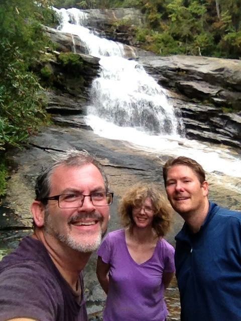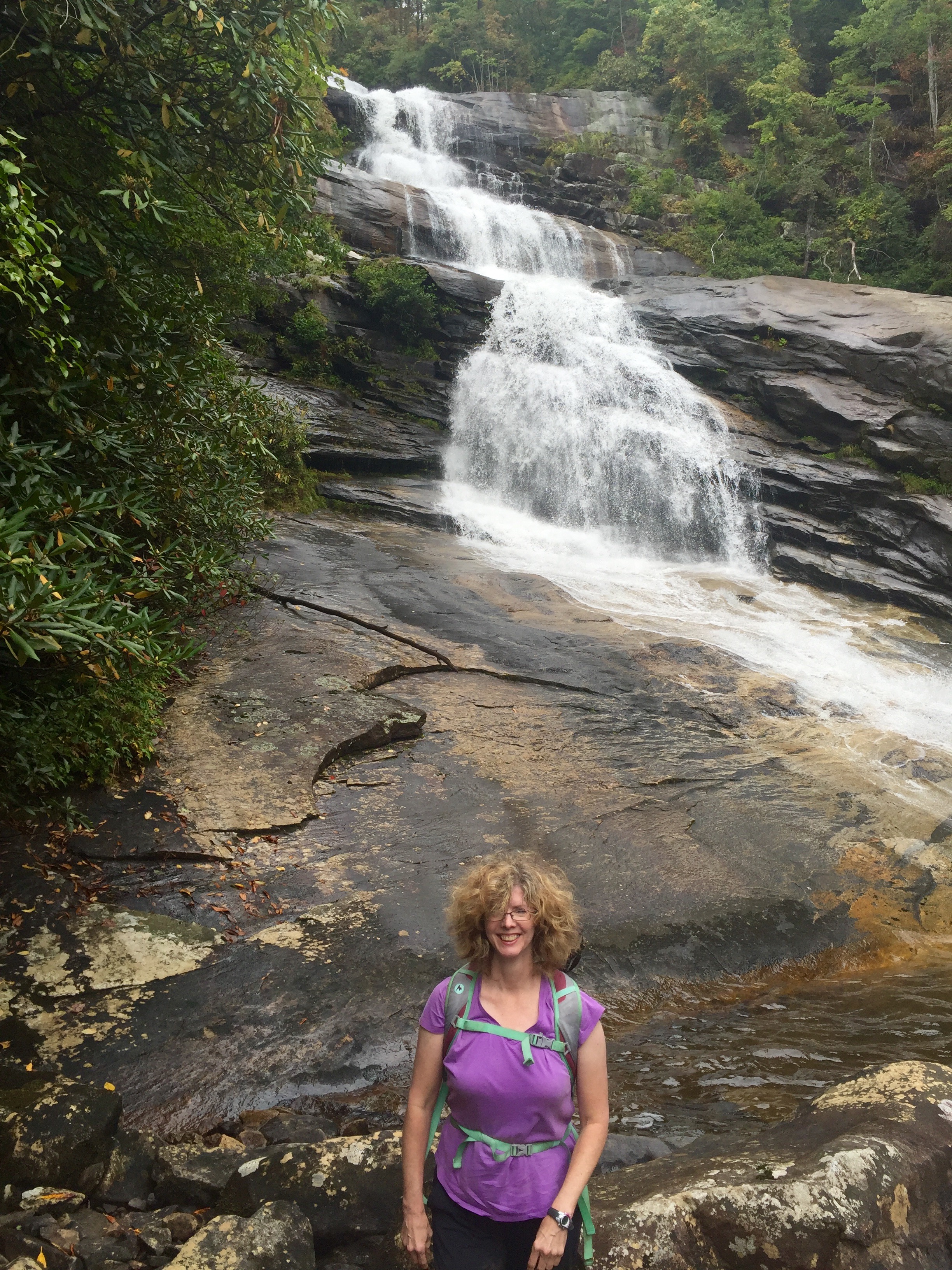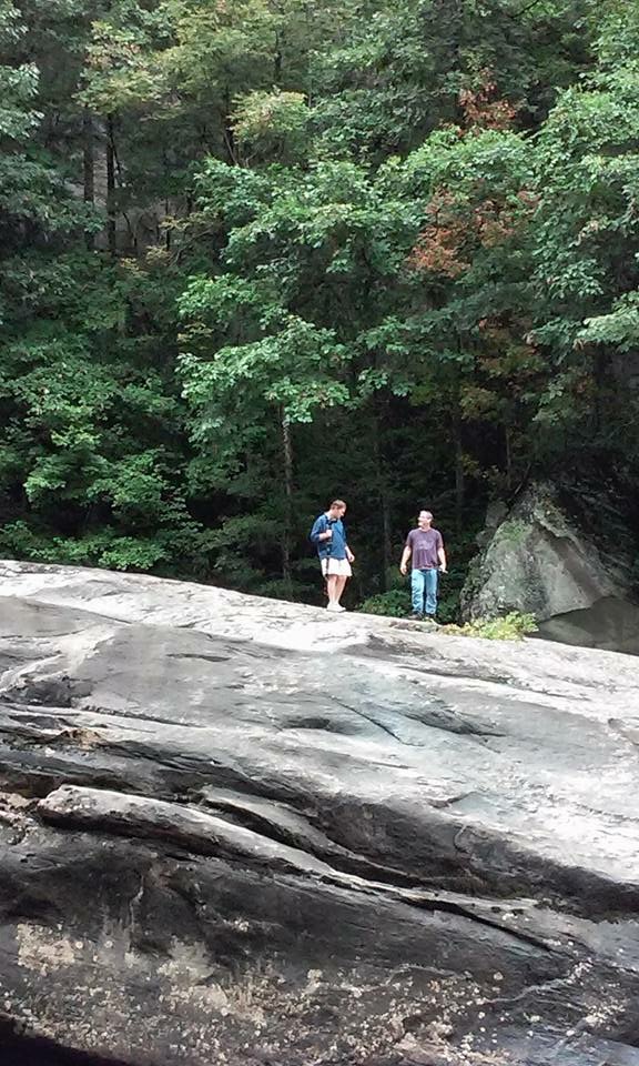Eventually, we knew we had to leave. As Mark and I were discussing the amazing views from the rock, a light rain began to fall which made Mark and I scurry off that large rock quickly. The rock is not a surface that you want to be trying to climb up or down on when it is wet. Before we began the trek back up, Mark took his usual group photo. Here it is, plus a nice shot that Beth took of us while we were on the rock. I returned favor and got one of her at the base of the falls.