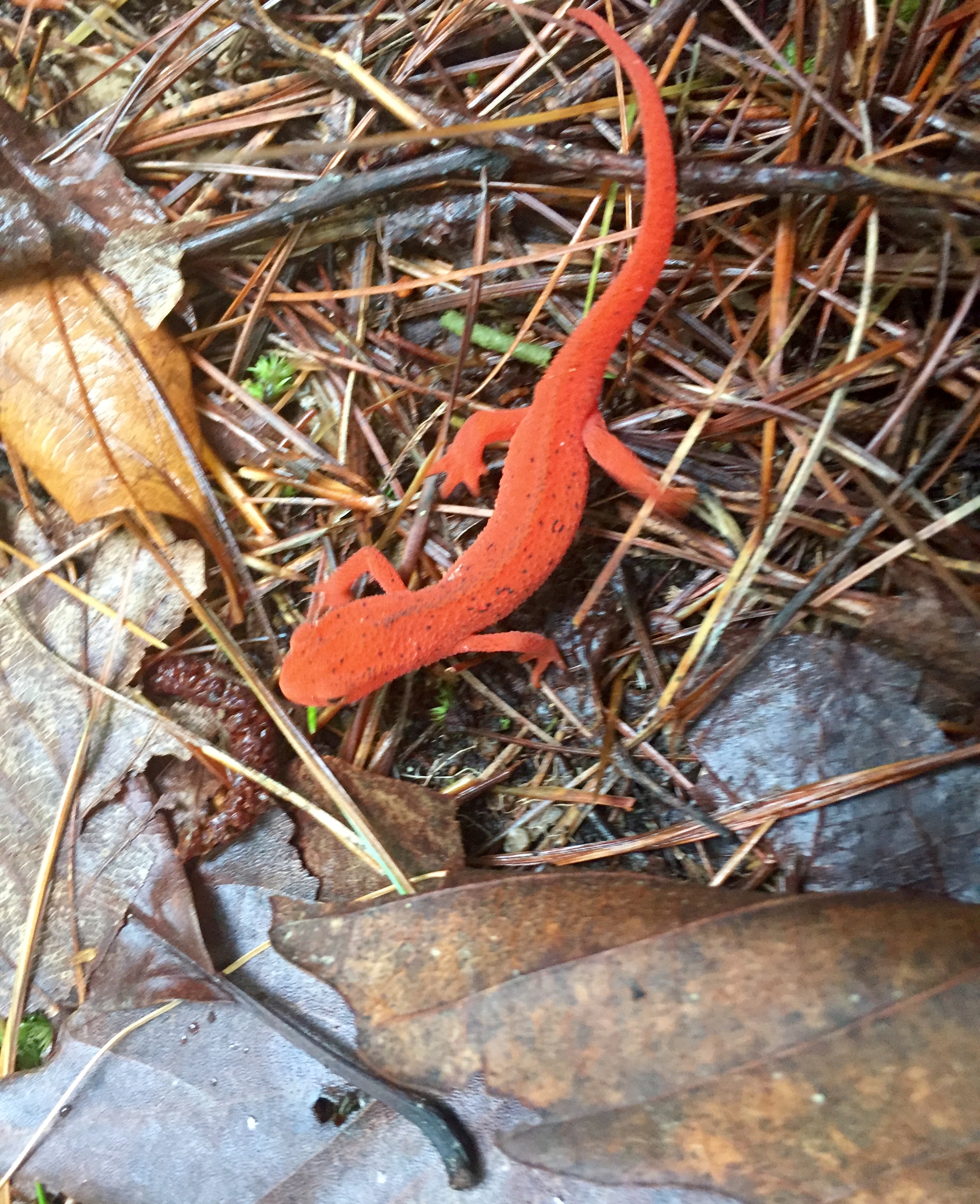 Once back on the main trail, the turn off for High Falls is soon coming. This is as far as I made it the first time I was on this trail, which is in very good shape for an unofficial trail, btw. It is definitely worth taking the side trip to High Falls but…we were focused on Big Falls and had just taken one side trip. So, we skipped it and once past the intersection for High Falls, the trail descended a tad around some switch backs. It was in this area that a pretty cool campsite is set up, with a spatula even provided…lol. We also came accros this little guy, a red spotted Newt I believe.