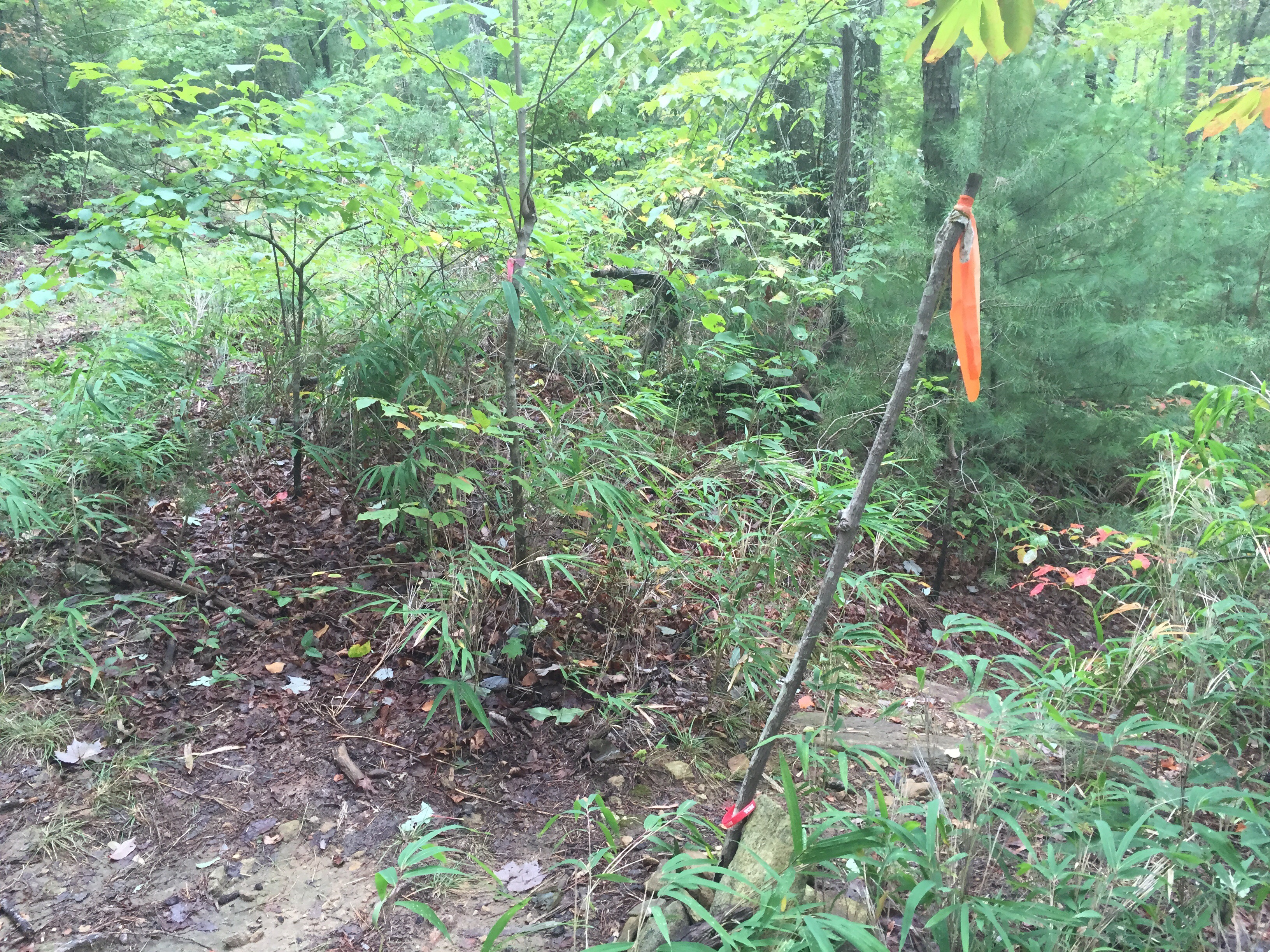 Waterfalls begin appearing just downstream from the crossing and there are at least 3 significant waterfalls between here and Big Falls that I know of, known as Waterfall #1, #2, and #3. #2 is now also known as Rich’s Falls, named after..Waterfall Rich. I’m sure there are also plenty of smaller, interesting cascades as well. None of this mattered to me on this day though as it was all about Big Falls. We skipped them all and finally, came up on the intersection of the side trail heading left and down to Big Falls. It is currently marked by a hiking stick, flagging tape and a small rock cairn. It is in the neighborhood of 3 miles from NC 281.